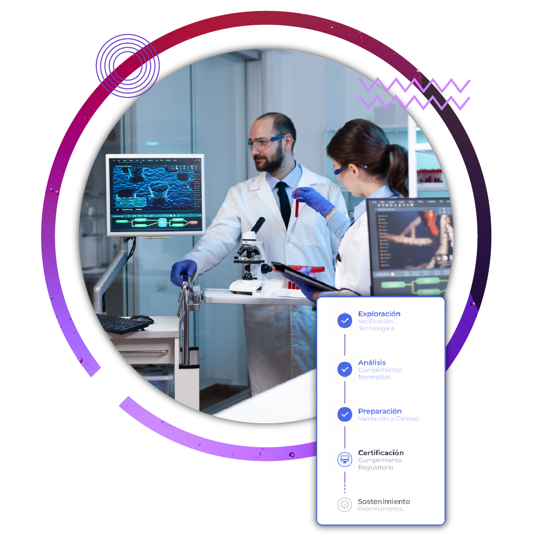 Nuestro equipo, con más de 25 años de experiencia, lidera la certificación en HealthTech y Biotech, representándote ante organismos reguladores para un proceso ágil y seguro.